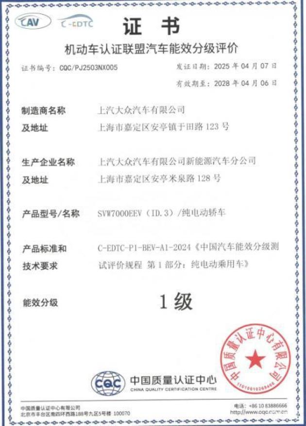 在能效方面,中国汽车能效开发与检测认证专业联盟首批纯电动乘用车能效分级测评中,ID.3在四项细分测试维度中获得全一级认证,获得“一级能效”评价。夏季高环测试中,ID.3还拿下了小型车极限里程、续航达成率三榜第一。