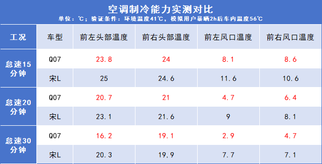 前两天我还看到了一组数据,两台车在环境温度41度下,模拟了用户暴晒2h后,怠速15分钟/20分钟/30分钟后的车内温度。在怠速15分钟后,长安启源Q07前左右风口温度分别为8.1℃、8.6℃,宋L DM-i分别是11.6℃、10.6℃,高于长安启源Q07。包括怠速20、30分钟后,也是长安启源Q07车内温度低,由此可见它的空调制冷效果更给力。