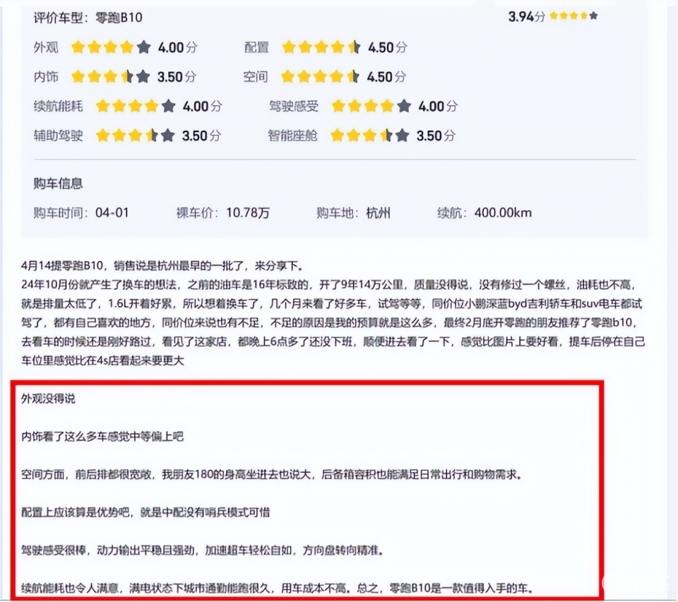 而且最近一位杭州的零跑B10车主也分享了自己的购车经历和购车后的使用情况,他对于零跑C10这款车的评价还是比较高的,不管是整车的外观设计、空间表现、配置、动力操控和续航都是很满意的。