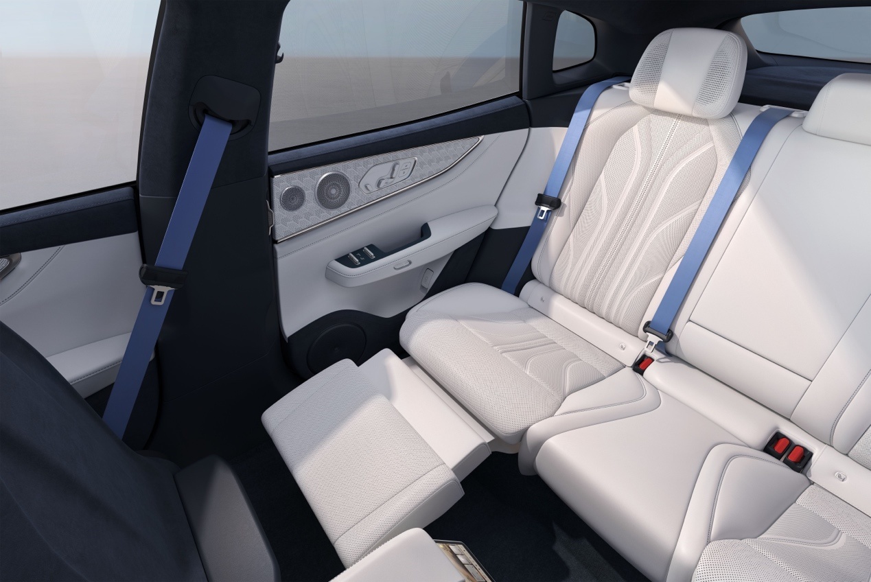 在座椅舒适度上,焕新001首次将极氪009备受好评的伊姆斯躺椅引入猎装车型,后排支持125度最大舒展躺角,配备4向电动腿托与2向电动脚踏,腿托最大延展350毫米,调节范围达87度,轻松实现近乎半躺的舒适姿态,让后排乘客尊享头等舱体验。