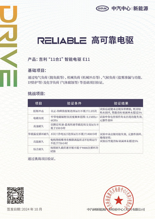 吉利星愿搭载行业首款11合1智能电驱,在功能高度集成的同时,还拥有同级领先的89.2%电驱效率,实现了同级最小的66L体积,将节省的空间以超大后备箱的形式还给了用户。通过了3000小时的台架耐久和200万公里的真实路试,星愿电驱完成了浸水工作、高温耐久、电磁抗扰、扭矩冲击、机械冲击等7大高难度挑战,获得了中汽研《高可靠电驱》的认证。