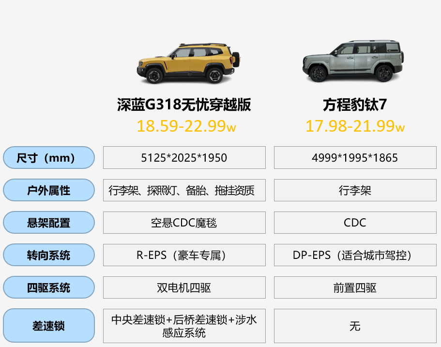 交叉轴测试中,深蓝G318 45000N·m/deg的高扭转刚度承载车身也很靠谱,在馒头包上车门开关依然顺畅。钛7因为有四驱,在馒头包上虽然打滑,但也顺利通过,只是后尾门关闭的时候有明显的触碰门框的声音,这说明车身发生了一定变形。我觉得,这些配置都是针对偶尔但必要的户外场景提供可靠支撑,比如去川西穿越,即便遇到突发烂路,也不用纠结“能不能过”,只管放心开就行。