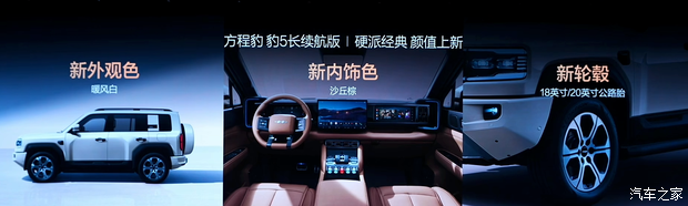 [汽车之家 新车上市] 10月20日,方程豹豹5(参数|询价)长续航版正式上市,共推出4款配置,售价区间为26.98万-32.98万元。豹5长续航版将拥有210km的纯电续航,并新增全新外观颜色暖风白以及沙丘棕内饰颜色,配置上也有优化调整。