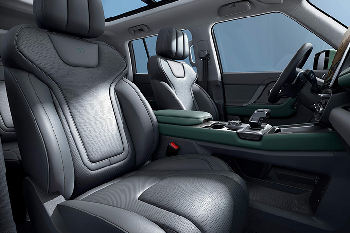 座舱部分两款车型所采用的设计理念有异曲同工之妙,都是中控台通过大量横线条进行覆盖,副驾前方均配备有扶手,在越野的时候能保持身体稳定,悬浮式中控大屏以及内嵌式的液晶仪表盘的组合也能确保座舱科技感,并且中岛区域都保留有实体按键旋钮,方便用户随时进行操作。