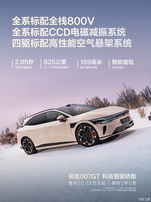 辅助驾驶方面,新车将标配激光雷达和双英伟达Orin-X智驾芯片,算力达到508TOPS,并会搭载最新的浩瀚智驾2.0版本,可实现高速和城市ZAP(智能领航辅助驾驶功能)、AVP代客泊车辅助、通用障碍物连续自动避让和哨兵模式等等。动力方面,新车提供单电机和双电机两种动力,其中单电机后驱版最大功率310kW,双电机四驱版综合功率475kW。电池和续航方面,75kWh磷酸铁锂电池的续航里程分别为585km和650km,100kWh的三元锂电池续航里程825km。另外极氪007GT全系采用800V平台,高配车型还将配备空气悬架,可提供5级高度调节。(文/汽车之家 周易)