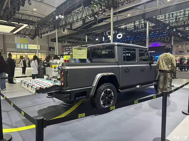 212 T01皮卡车型在广州车展首发亮相。212 T01皮卡车型依然采用了复古造型的设计,不过相比SUV版车型,前脸中网增加了硕大的212字样增加辨识度,同时加入更具越野属性的前后保险杠以及轮圈、翼子板等造型。