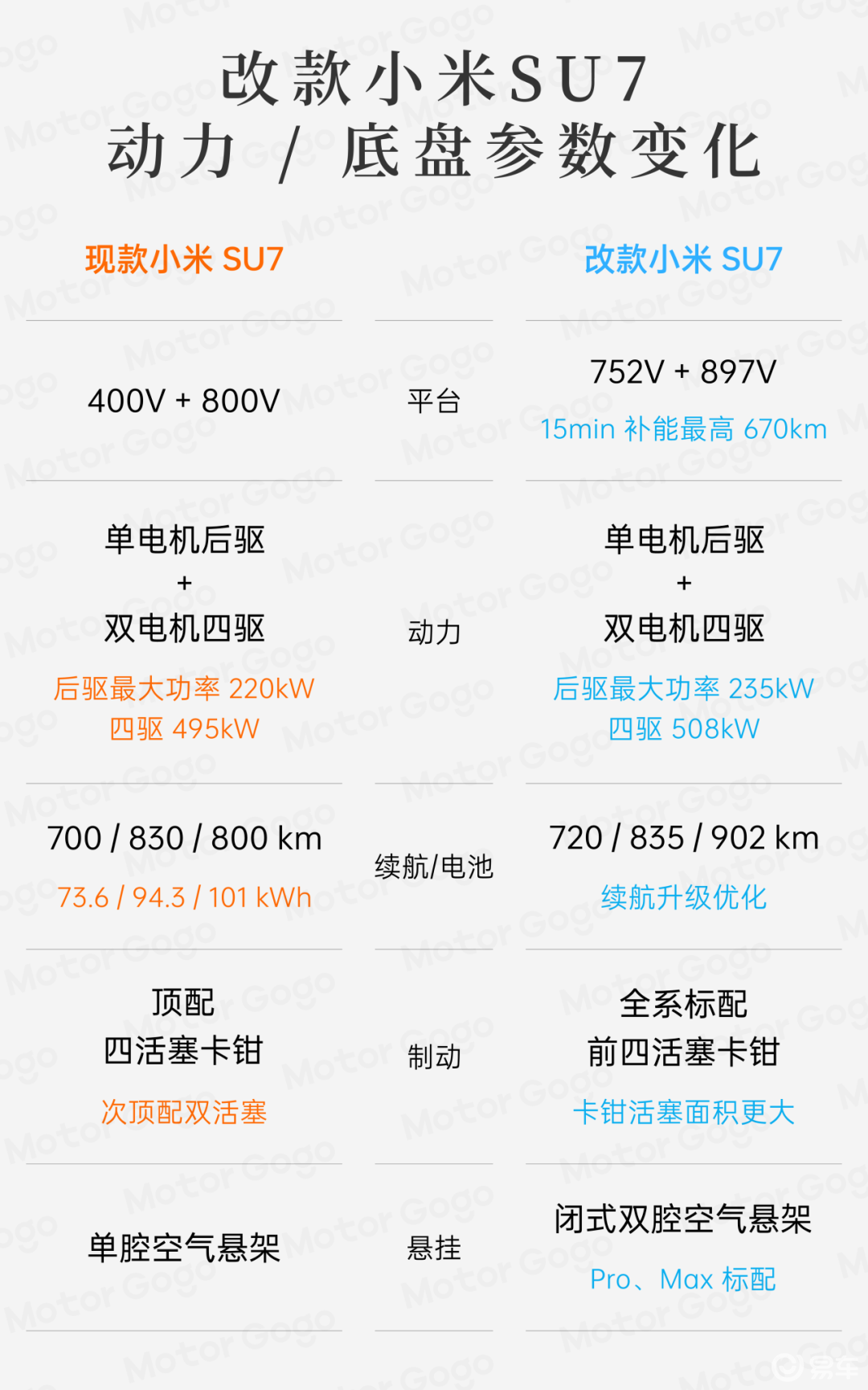 首先是平台架构上,现款小米 SU7 采用了 400V+800V 两种 SKU,而改款 SU7 则是采用了和新款 YU7 一样采用全系升级 800V 的动力平台。